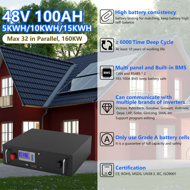 그만큼 48V 리튬 배터리 팩 Lithcoreenergy.com은 Growatt, Goodwe, Deye, Victron 등 대부분의 유명 인버터와 호환됩니다. 용량 확장을 위한 무제한 병렬 처리를 지원하고 최대 32개의 병렬 통신을 지원합니다.